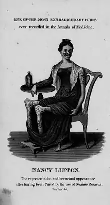 Swaim used a symbol of Hercules killing the Hydra in early advertisements of his product, which was being bottled in rectangular bottles by 1825, and in green cylindrical bottles by 1829.[12] Swaim advertised heavily, and took advantage of developments in commercial lithography in the 1830s to advertise his concoction with a portrait of a woman named Nancy Linton, advertising her "actual appearance" after being cured, although this appearance still looks rather gruesome to modern eyes. The panacea contained mercury, and Linton's appearance appears to reflect signs of mercury poisoning.[13] Mercuric chloride (called corrosive sublimate at the time) did have a prior history of being used to treat syphilis. Oil of wintergreen and sarsaparilla were primary ingredients of Swaim's product.