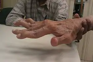 Swan neck deformity is a deformed position of the finger, in which the joint closest to the fingertip is permanently bent toward the palm while the nearest joint to the palm is bent away from it (DIP flexion with PIP hyperextension). It is commonly caused by injury, hypermobility or inflammatory conditions like rheumatoid arthritis or sometimes familial (congenital, like Ehlers–Danlos syndrome[1]).
