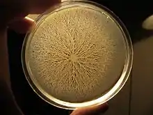 - Julkowska, D.; Obuchowski, M; Holland, IB; Séror, SJ (2004). "Branched swarming patterns on a synthetic medium formed by wild-type Bacillus subtilis strain 3610: detection of different cellular morphologies and constellations of cells as the complex architecture develops". Microbiology. 150 (Pt 6): 1839–49. doi:10.1099/mic.0.27061-0. PMID 15184570.