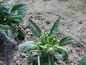The sweet potato leaf curl virus is one of more than 20 viruses known to infect the sweet potato.[2] It is part of a group of sweet potato-infecting Begomoviruses generally known as "sweepoviruses".[3] Viruses are common among sweet potatoes because their propagation is commonly dependent on stored roots or stems. Therefore, viruses can build up and have delayed emergence over the years.[4] Viruses in sweet potatoes are problematic because they decrease crop yield and quality of storage roots.[5] This is problematic as sweet potatoes are ranked seventh for global food crops.[4]