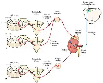 The sympathoadrenal system is a physiological connection between the sympathetic nervous system and the adrenal medulla and is crucial in an organism's physiological response to outside stimuli.[1] When the body receives sensory information, the sympathetic nervous system sends a signal to preganglionic nerve fibers, which activate the adrenal medulla through acetylcholine. Once activated, norepinephrine and epinephrine are released directly into the blood by postganglionic nerve fibers where they act as the bodily mechanism for "fight-or-flight" responses. Because of this, the sympathoadrenal system plays a large role in maintaining glucose levels, sodium levels, blood pressure, and various other metabolic pathways that couple with bodily responses to the environment.[1] During numerous diseased states, such as hypoglycemia or even stress, the body's metabolic processes are skewed. The sympathoadrenal system works to return the body to homeostasis through the activation or inactivation of the adrenal gland. However, more severe disorders of the sympathoadrenal system such as phaeochromocytoma (a tumor on the adrenal medulla) can affect the body's ability to maintain a homeostatic state. In such cases, curative agents such as adrenergic agonists and antagonists are used to modify epinephrine and norepinephrine levels released by the adrenal medulla.[2]