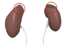 This is a representation of the kidneys in the human body. The left kidney depicted is healthy with normal functioning. The right kidney depicted has a tumor (shown inside the red circle). This disease is called pheochromocytoma and causes an increased level of adrenaline to be released into the circulatory system.