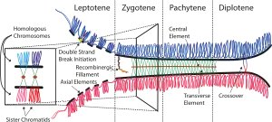 The synaptonemal complex is a tripartite structure consisting of two parallel lateral regions and a central element. This "tripartite structure" is seen during the pachytene stage of the first meiotic prophase, both in males and in females during gametogenesis. Previous to the pachytene stage, during leptonema, the lateral elements begin to form and they initiate and complete their pairing during the zygotene stage. After pachynema ends, the SC usually becomes disassembled and can no longer be identified.[2]