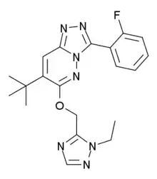 - Carling RW, Madin A, Guiblin A, Russell MG, Moore KW, Mitchinson A, et al. (November 2005). "7-(1,1-Dimethylethyl)-6-(2-ethyl-2H-1,2,4-triazol-3-ylmethoxy)-3-(2-fluorophenyl)-1,2,4-triazolo[4,3-b]pyridazine: a functionally selective gamma-aminobutyric acid(A) (GABA(A)) alpha2/alpha3-subtype selective agonist that exhibits potent anxiolytic activity but is not sedating in animal models". Journal of Medicinal Chemistry. 48 (23): 7089–92. doi:10.1021/jm058034a. PMID 16279764.