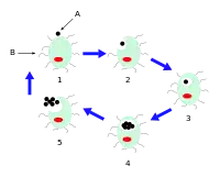Life cycle of Chlamydia pneumoniae. A — Chlamydia elementary body. B — Lung cell. 2 — Chlamydia enters the cell. 3—Elementary body becomes a reticulate body. 4 — Replication. 5 — Reticulate bodies become elementary bodies and are released to infect other cells.