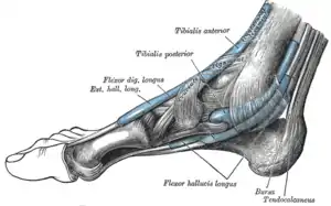 Tarsal tunnel syndrome (TTS), is a compression neuropathy and painful foot condition in which the tibial nerve is compressed as it travels through the tarsal tunnel.[1] This tunnel is found along the inner leg behind the medial malleolus (bump on the inside of the ankle). The posterior tibial artery, tibial nerve, and tendons of the tibialis posterior, flexor digitorum longus, and flexor hallucis longus muscles travel in a bundle through the tarsal tunnel. Inside the tunnel, the nerve splits into three segments. One nerve (calcaneal) continues to the heel, the other two (medial and lateral plantar nerves) continue on to the bottom of the foot. The tarsal tunnel is delineated by bone on the inside and the flexor retinaculum on the outside.