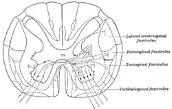 ![]() Diagram of the principal fasciculi of the spinal cord. ("Tectospinal fasciculus" labeled at center right, in red.) | |
