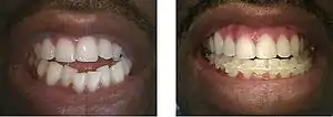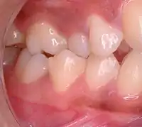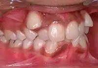 A deep bite (also known as a Type II Malocclusion) is a condition in which the upper teeth overlap the lower teeth, which can result in hard and soft tissue trauma, in addition to an effect on appearance.[25] It has been found to occur in 15–20% of the US population.[26]