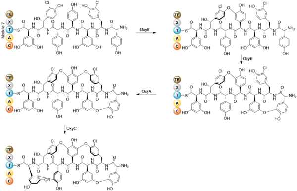 Once the heptapeptide backbone has been formed, the linear enzyme-bound intermediate is cyclized.[11] Gene disruption studies indicate cytochrome P450 oxygenases as the enzymes that performs the coupling reactions. The X-domain in the final NRPS module is required to recruit the oxygenase enzymes.[13] OxyB forms the first ring by coupling residues 4 and 6, and OxyE then couples residues 1 and 3. OxyA couples residues 2 and 4, followed by the formation of a C-C bond between residues 5 and 7 by OxyC.[14] The regioselectivity and atropisomer selectivity of these probable one-electron coupling reactions has been suggested to be due to the folding and orientation requirements of the partially crossed-linked substrates in the enzyme active site.[11] The coupling reactions are shown below.