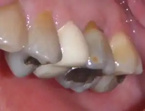 A temporary crown (provisional crown, interim crown) is a temporary (short-term) crown used in dentistry. Like other interim restorations, it serves until a final (definitive) restoration can be inserted. Usually the temporary crown is constructed from acrylic resins (monomethacrylate based / polymethacrylate) based or, chemical-cure / light cure composite (dimethacrylate based) , although alternative systems using aluminium crown forms are occasionally used.[1] Temporary crowns function to protect the tooth, prevent teeth shifting, provide cosmetics, shape the gum tissue properly, and prevent sensitivity.[2]