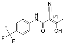 Teriflunomide, sold under the brand name Aubagio, is the active metabolite of leflunomide.[2] Teriflunomide was investigated in the Phase III clinical trial TEMSO as a medication for multiple sclerosis (MS). The study was completed in July 2010.[3] 2-year results were positive.[4] However, the subsequent TENERE head-to-head comparison trial reported that "although permanent discontinuations [of therapy] were substantially less common among MS patients who received teriflunomide compared with interferon beta-1a, relapses were more common with teriflunomide."[5] The drug was approved for use in the United States in September 2012[6][7] and for use in the European Union in August 2013.[8]