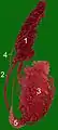 ![]() Vertical section of the testis, to show the arrangement of the ducts (internal spermatic artery labeled vertically at center) | |