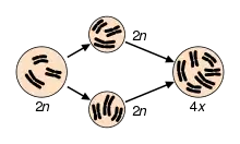 Rarely, autopolyploids arise from spontaneous, somatic genome doubling, which has been observed in apple (Malus domesticus) bud sports.[17] This is also the most common pathway of artificially induced polyploidy, where methods such as protoplast fusion or treatment with colchicine, oryzalin or mitotic inhibitors are used to disrupt normal mitotic division, which results in the production of polyploid cells. This process can be useful in plant breeding, especially when attempting to introgress germplasm across ploidal levels.[18]
