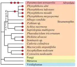 Other eukaryotic taxa have experienced one or more polyploidization events during their evolutionary history (see Albertin and Marullo, 2012[73] for review). The oomycetes, which are non-true fungi members, contain several examples of paleopolyploid and polyploid species, such as within the genus Phytophthora.[87] Some species of brown algae (Fucales, Laminariales[88] and diatoms[89]) contain apparent polyploid genomes. In the Alveolata group, the remarkable species Paramecium tetraurelia underwent three successive rounds of whole-genome duplication[90] and established itself as a major model for paleopolyploid studies.