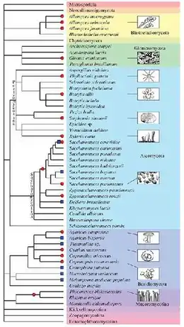 Schematic phylogeny of the fungi. Red circles indicate polyploidy, blue squares indicate hybridization. From Albertin and Marullo, 2012[73]