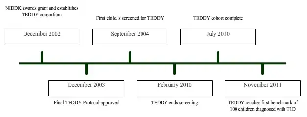 Recruitment for the TEDDY study began in 2004 and was completed in 2010.[6] Potential TEDDY subjects were identified at birth by genetic screening of the HLA-DR/DQ loci, which are considered to be highly important in determining whether an individual will develop Type 1 Diabetes.[7] Parents of newborns with HLA DR/DQ genotypes associated with a high risk for T1D were approached for enrollment in the study.[6]