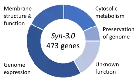 In 2016, the Venter Institute used genes from JCVI-syn1.0 to synthesize a smaller genome they call JCVI-syn3.0, that contains 531,560 base pairs and 473 genes.[b 8] In 1996, after comparing M. genitalium with another small bacterium Haemophilus influenza, Arcady Mushegian and Eugene Koonin had proposed that there might be a common set of 256 genes which could be a minimal set of genes needed for viability.[b 9][a 19] In this new organism, the number of genes can only be pared down to 473, 149 of which have functions that are completely unknown.[b 9] In 2019 a complete computational model of all pathways in Syn3.0 cell was published, representing the first complete in silico model for a living minimal organism.[a 20]