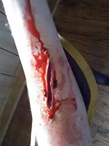 The art of moulage uses theatrical blood in applying mock injuries for the purpose of training emergency response teams and other medical and military personnel.