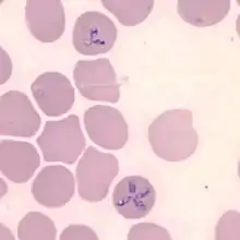 An important difference from malaria is that B. microti does not infect liver cells. Additionally, the piroplasm is spread by tick bites (Ixodes scapularis, the same tick that spreads Lyme disease), while the malaria protozoans are spread via mosquito. Finally, under the microscope, the merozoite form of the B. microti lifecycle in red blood cells forms a cross-shaped structure, often referred to as a "Maltese cross" or tetrad, in addition to intracellular "ring forms" which are also seen in the malaria parasite (Plasmodium spp.).[3]