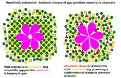Thus, according to the modern lipid hypothesis anaesthetics do not act directly on their membrane protein targets, but rather perturb specialized lipid matrices at the protein-lipid interface, which act as mediators. This is a new kind of transduction mechanism, different from the usual key-lock interaction of ligand and receptor, where the anaesthetic (ligand) affects the function of membrane proteins by binding to the specific site on the protein. Thus, some membrane proteins are proposed to be sensitive to their lipid environment. A slightly different detailed molecular mechanism of how bilayer perturbation can influence the ion-channel was proposed in the same year. Oleamide (fatty acid amide of oleic acid) is an endogenous anaesthetic found in vivo (in the cat’s brain) and it is known to potentiate sleep and lower the temperature of the body by closing the gap junction channel connexion.[33] The detailed mechanism is shown on the picture: the well-ordered lipid(green)/cholesterol(yellow) ring that exists around connexon (magenta) becomes disordered on treatment with anaesthetic (red triangles), promoting a closure of connexon ion channel. This decreases brain activity and induces lethargy and anaesthetic effect. Recently super resolution imaging showed direct experimental evidence that volatile anesthetic disrupt the ordered lipid domains as predicted.[34] In the same study, a related mechanism emerged where the anesthetics released the enzyme phospholipase D (PLD) from lipid domains and the enzyme bound to and activated TREK-1 channel by the production of phosphatidic acid. These results showed experimentally that the membrane is a physiologically relevant target of general anesthetics.