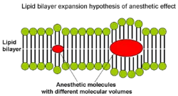 From the correlation between lipid solubility and anaesthetic potency, both Meyer and Overton had surmised a unitary mechanism of general anaesthesia. They assumed that solubilization of lipophilic general anaesthetic in lipid bilayer of the neuron causes its malfunction and anaesthetic effect when critical concentration of anaesthetic is reached. Later in 1973 Miller and Smith suggested the critical volume hypothesis also called lipid bilayer expansion hypothesis.[13] They assumed that bulky and hydrophobic anaesthetic molecules accumulate inside the hydrophobic (or lipophilic) regions of neuronal lipid membrane causing its distortion and expansion (thickening) due to volume displacement. Accumulation of critical amounts of anaesthetic causes membrane thickening sufficient to reversibly alter function of membrane ion channels thus providing anaesthetic effect. Actual chemical structure of the anaesthetic agent per se is not important, but its molecular volume plays the major role: the more space within membrane is occupied by anaesthetic - the greater is the anaesthetic effect. Based on this theory, in 1954 Mullins suggested that the Meyer-Overton correlation with potency can be improved if molecular volumes of anaesthetic molecules are taken into account.[14] This theory existed for over 60 years and was supported by experimental fact that increases in atmospheric pressure reverse anaesthetic effect (pressure reversal effect).