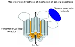 These observations were important because they demonstrated that general anaesthetics may also interact with hydrophobic protein sites of certain proteins, rather than affect membrane proteins indirectly through nonspecific interactions with lipid bilayer as mediator.[8][39] It was shown that anaesthetics alter the functions of many cytoplasmic signalling proteins, including protein kinase C,[40][41] however, the proteins considered the most likely molecular targets of anaesthetics are ion channels. According to this theory general anaesthetics are much more selective than in the frame of lipid hypothesis and they bind directly only to small number of targets in CNS mostly ligand(neurotransmitter)-gated ion channels in synapse and G-protein coupled receptors altering their ion flux. Particularly Cys-loop receptors[42] are plausible targets for general anaesthetics that bind at the interface between the subunits. The Cys-loop receptor superfamily includes inhibitory receptors (GABA A, GABA C, glycine receptors) and excitatory receptors (acetylcholine receptor and 5-HT3 serotonin receptor). General anaesthetics can inhibit the channel functions of excitatory receptors or potentiate functions of inhibitory receptors, respectively. Although protein targets for anaesthetics have been partly identified the exact nature of general anaesthetic-protein interactions still remains a mystery.