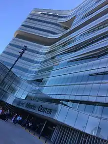 Jacobs Medical Center (32.877659°N 117.226584°W / 32.877659; -117.226584) opened on November 20, 2016.[4] It is the second component of UC San Diego Health's two-campus strategy and provides specialized quaternary care not available elsewhere in San Diego County. The 364-bed advanced medical center is divided into four separate pavilions: Thornton Pavilion, Vassiliadis Pavilion (floors 2-3), Foster Pavilion (floors 4-6), and Rady Pavilion (floors 8-10). The A. Vassiliadis Family Pavilion for Advanced Surgery includes intraoperative MRI machines and the only Restrictive Spectrum Imaging facility in the United States. The Pauline and Stanley Foster Pavilion for Cancer Care houses a blood and marrow transplant program jointly operated by UC San Diego Health and Sharp Healthcare, the floor for which is completely pressurized and filtered allowing patients to roam freely. The Rady Pavilion for Women and Infants includes a Level III Neonatal Intensive Care Unit, eight labor rooms, 32 private postpartum rooms, and a three-room midwifery birth center.[5] Each of the hospital's private rooms is equipped with an Apple iPad for controlling lighting, checking medical records, and contacting care providers.[4] The facility is named for Joan and Irwin Jacobs in recognition of a $75 million gift they made to support its construction.