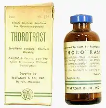 Thorotrast is a suspension containing particles of the radioactive compound thorium dioxide, ThO2, that was used as a radiocontrast agent in medical radiography in the 1930s and 1940s. Use in some countries, such as the U.S., continued into the 1950s.