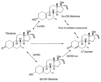 The mean oral bioavailability of tibolone is 92%.[4] Its plasma protein binding is 96.3%.[4] It is bound to albumin, and both tibolone and its metabolites have low affinity for SHBG.[4][1] Tibolone is metabolized in the liver and intestines.[1][5] It is a prodrug and is rapidly transformed into several metabolites, including δ4-tibolone, 3α-hydroxytibolone, and 3β-hydroxytibolone, as well as sulfate conjugates of these metabolites.[1][53][7] 3α-Hydroxytibolone is formed by 3α-hydroxysteroid dehydrogenase, 3β-hydroxytibolone is formed by 3β-hydroxysteroid dehydrogenase, δ4-tibolone is formed by Δ5-4-isomerase, and the sulfate conjugates of tibolone and its metabolites are formed by sulfotransferases, mainly SULT2A1.[34] [54] The sulfate conjugates can be transformed back into free steroids by steroid sulfatase.[55] Following a single oral dose of 2.5 mg tibolone, peak serum levels of tibolone were 1.6 ng/mL, of δ4-tibolone were 0.8 ng/mL, of 3α-hydroxytibolone were 16.7 ng/mL, and of 3β-hydroxytibolone were 3.7 ng/mL after 1 to 2 hours.[1] The elimination half-life of tibolone is 45 hours.[5] It is excreted in urine 40% and feces 60%.[4][5]