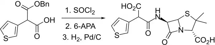One synthesis began by making the monobenzyl ester of 3-Thienylmalonic acid, converting this to the acid chloride with SOCl2, and condensing it with 6-Aminopenicillanic acid (6-APA). Hydrogenolysis (Pd/C) completed the synthesis of ticarcillin.