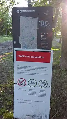 May 3 — As Montrealers experienced their second day of +20 °C (68 °F) weather of the year and began crowding into parks,[30] the city announced the closure of the parking lots at La Fontaine Park, Maisonneuve Park, Jarry Park, Frédéric-Back Park, and the Île de la Visitation nature park, effective May 3, 2020.[31][32]