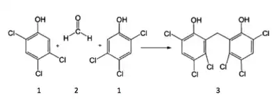From 1970 to 1972, NEPACCO was primarily involved in the production of hexachlorophene (3), an antibacterial agent used in soap, toothpaste, and common household disinfectants, from 2,4,5-trichlorophenol (1) and formaldehyde (2).[9][10]