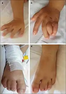 The most striking sign of Timothy syndrome is the co-occurrence of both syndactyly (about 0.03% of births) and long QT syndrome (1% per year) in a single patient. Other common symptoms include cardiac arrhythmia (94%), heart malformations (59%), and autism or an autism spectrum disorder (80% who survive long enough for evaluation). Facial dysmorphologies such as flattened noses also occur in about half of patients. Children with this disorder have small teeth, which due to poor enamel coating, are prone to dental cavities and often require removal. The average age of death due to complications of these symptoms is 2.5 years.[1][2][3]