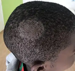 Tinea capitis (also known as "herpes tonsurans",[1] "ringworm of the hair",[1] "ringworm of the scalp",[1] "scalp ringworm",[2] and "tinea tonsurans"[1]) is a cutaneous fungal infection (dermatophytosis) of the scalp.[3] The disease is primarily caused by dermatophytes in the genera Trichophyton and Microsporum that invade the hair shaft. The clinical presentation is typically single or multiple patches of hair loss, sometimes with a 'black dot' pattern (often with broken-off hairs), that may be accompanied by inflammation, scaling, pustules, and itching. Uncommon in adults, tinea capitis is predominantly seen in pre-pubertal children, more often boys than girls.