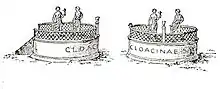 The inhabitants of ancient Rome had a sewer goddess, a toilet god and a god of excrement. The sewer goddess Cloacina (named from the Latin word cloaca or sewer) was borrowed from Etruscan mythology and became seen as the protectoress of the Cloaca Maxima, Rome's sewage system. An early Roman ruler, Titus Tatius, built a shrine to her in his toilet; she was invoked if sewers became blocked or backed up.[15] She was later merged with the better-known Roman goddess Venus and was worshipped at the Shrine of Venus Cloacina in the Roman Forum.[16]