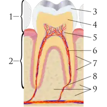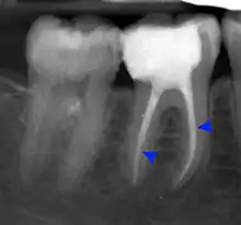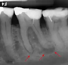Apical periodontitis is acute or chronic inflammation around the apex of a tooth caused by an immune response to bacteria within an infected pulp.[20] It does not occur because of pulp necrosis, meaning that a tooth that tests as if it's alive (vital) may cause apical periodontitis, and a pulp which has become non-vital due to a sterile, non-infectious processes (such as trauma) may not cause any apical periodontitis.[10]:225 Bacterial cytotoxins reach the region around the roots of the tooth via the apical foramina and lateral canals, causing vasodilation, sensitization of nerves, osteolysis (bone resorption) and potentially abscess or cyst formation.[10]:228