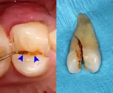 Cracked tooth syndrome refers to a highly variable[30] set of pain-sensitivity symptoms that may accompany a tooth fracture, usually sporadic, sharp pain that occurs during biting or with release of biting pressure,[31] or relieved by releasing pressure on the tooth.[10]:24 The term is falling into disfavor and has given way to the more generalized description of fractures and cracks of the tooth, which allows for the wide variations in signs, symptoms, and prognosis for traumatized teeth. A fracture of a tooth can involve the enamel, dentin, and/or pulp, and can be orientated horizontally or vertically.[10]:24–25 Fractured or cracked teeth can cause pain via several mechanisms, including dentin hypersensitivity, pulpitis (reversible or irreversible), or periodontal pain. Accordingly, there is no single test or combination of symptoms that accurately diagnose a fracture or crack, although when pain can be stimulated by causing separation of the cusps of the tooth, it's highly suggestive of the disorder.[10]:27–31 Vertical fractures can be very difficult to identify because the crack can rarely be probed[10]:27 or seen on radiographs, as the fracture runs in the plane of conventional films (similar to how the split between two adjacent panes of glass is invisible when facing them).[10]:28–9