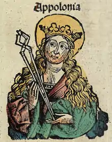 In Christianity, Saint Apollonia is the patron saint of toothache and other dental problems. She was an early Christian martyr who was persecuted for her beliefs in Alexandria during the Imperial Roman age. A mob struck her repeatedly in the face until all her teeth were smashed. She was threatened with being burned alive unless she renounced Christianity, but she instead chose to throw herself onto the fire. Supposedly, toothache sufferers who invoke her name will find relief.[56]