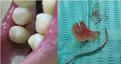A variant of the periodontal abscess is the gingival abscess, which is limited to the gingival margin, has a quicker onset, and is typically caused by trauma from items such as a fishbone, toothpick, or toothbrush, rather than chronic periodontitis.[21]:446–447 The treatment of a periodontal abscess is similar to the management of dental abscesses in general (see: Treatment). However, since the tooth is typically alive, there is no difficulty in accessing the source of infection and, therefore, antibiotics are more routinely used in conjunction with scaling and root planing.[23] The occurrence of a periodontal abscess usually indicates advanced periodontal disease, which requires correct management to prevent recurrent abscesses, including daily cleaning below the gumline to prevent the buildup of subgingival plaque and calculus.