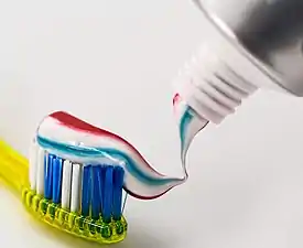 Toothpaste is a paste or gel dentifrice used with a toothbrush to clean and maintain the aesthetics and health of teeth. Toothpaste is used to promote oral hygiene: it is an abrasive that aids in removing dental plaque and food from the teeth, assists in suppressing halitosis, and delivers active ingredients (most commonly fluoride) to help prevent tooth decay (dental caries) and gum disease (gingivitis).[1] Salt and sodium bicarbonate (baking soda) are among materials that can be substituted for commercial toothpaste. Large amounts of swallowed toothpaste can be toxic.[2]
