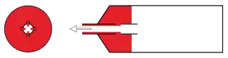 The red area represents the material used for stripes, and the rest is the main toothpaste material. The two materials are not in separate compartments; they are sufficiently viscous that they will not mix. Applying pressure to the tube causes the main material to issue out through the pipe. Simultaneously, some of the pressure is forwarded to the stripe-material, which is thereby pressed onto the main material through holes in the pipe.