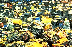 Organic wastes can be destroyed by incineration at high temperatures.[11] However, if the waste contains heavy metals or radioactive isotopes, these must be separated and stored, as they cannot be destroyed.[12] The method of storage will seek to immobilize the toxic components of the waste, possibly through storage in sealed containers, inclusion in a stable medium such as glass or a cement mixture, or burial under an impermeable clay cap. Waste transporters and waste facilities may charge fees; consequently, improper methods of disposal may be used to avoid paying these fees. Where the handling of toxic waste is regulated, the improper disposal of toxic waste may be punishable by fines[6] or prison terms. Burial sites for toxic waste and other contaminated brownfield land may eventually be used as greenspace or redeveloped for commercial or industrial use.