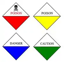 The Indian standardized system of toxicity labels for pesticides uses a 4-color system (red, yellow, blue, green) to plainly label containers with the toxicity class of the contents.