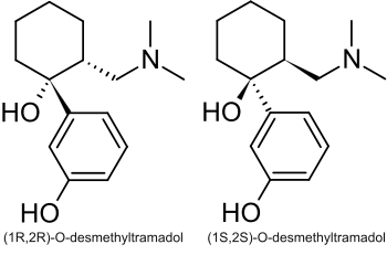 Tramadol induces analgesic effects through a variety of different targets on the noradrenergic system, serotoninergic system and opioid receptors system.[41] Tramadol exists as a racemic mixture, the positive enantiomer inhibits serotonin reuptake while the negative enantiomer inhibits noradrenaline re-uptake, by binding to and blocking the transporters.[42][8] Tramadol has also been shown to act as a serotonin releasing agent. Both enantiomers of tramadol are agonists of the μ-opioid receptor and its M1 metabolite, O-desmetramadol, is also a μ-opioid receptor agonist but is 6 times more potent than tramadol itself.[43] All these effects work synergistically to induce analgesia.