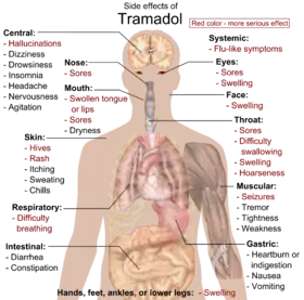 As is typical of opioids, common side effects include constipation, itchiness, and nausea.[3] Serious side effects may include seizures, increased risk of serotonin syndrome, decreased alertness, and drug addiction.[3] A change in dosage may be recommended in those with kidney or liver problems.[3] It is not recommended in those who are at risk of suicide or in those who are pregnant.[3][10] While not recommended in women who are breastfeeding, those who take a single dose should not generally stop breastfeeding.[11] Tramadol is converted in the liver to O-desmethyltramadol (desmetramadol), an opioid with stronger binding to the μ-opioid receptor.[3][12] Tramadol is also a serotonin–norepinephrine reuptake inhibitor (SNRI).[3][13]