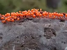 | Trichia decipiens plasmodium and sporangia on a tree trunk | |