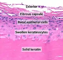 A trichilemmal cyst is a common cyst that forms from a hair follicle, most often on the scalp, and is smooth, mobile and filled with keratin, a protein component found in hair, nails, skin, and horns. Trichilemmal cysts are clinically and histologically distinct from trichilemmal horns, which are much rarer and not limited to the scalp.[3] Rarely, these cysts may grow more extensively and form rapidly multiplying trichilemmal tumors, also called proliferating trichilemmal cysts, which are benign but may grow aggressively at the cyst site.[4] Very rarely, trichilemmal cysts can become cancerous.[5]