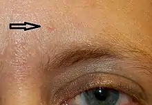 Trichilemmoma (also known as "tricholemmoma"[1]) is a benign cutaneous neoplasm that shows differentiation toward cells of the outer root sheath.[2]:673[3] The lesion is often seen in the face and neck region. Multifocal occurrence is associated with Cowden syndrome, in which hamartomatous intestinal polyposis is seen in conjunction with multiple tricholemmoma lesions.