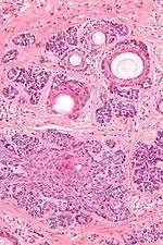 | Micrograph of a trichoepithelioma. H&E stain. | |