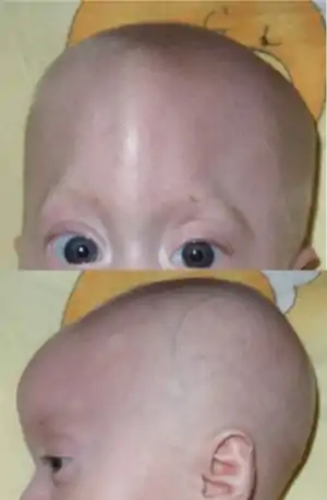 - a normal cephalic index (maximum cranium width / maximum cranium length) however, there is bitemporal shortening and biparietal broadening